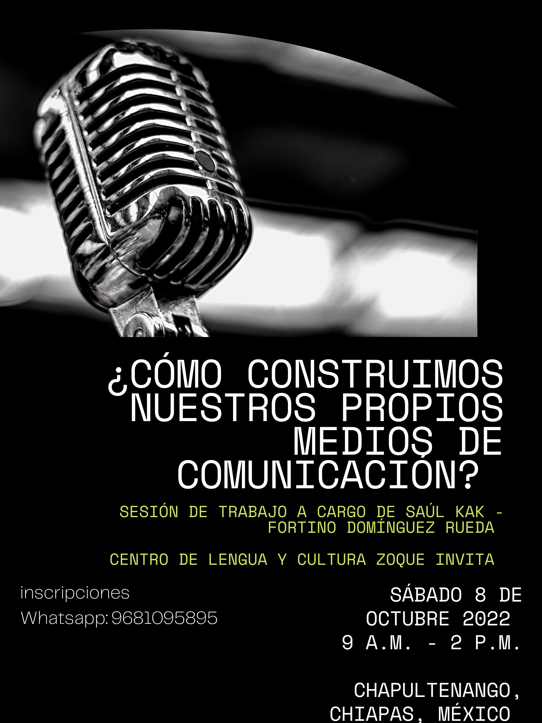 Preguntas generadoras: ¿Los zoques cómo somos representados en los medios de comunicación masiva? ¿Cuándo y cómo somos noticias en los medios de arriba? ¿Cómo levantamos nuestra propia voz? ¿Para qué compartir al mundo las historias de los pueblos zoques?