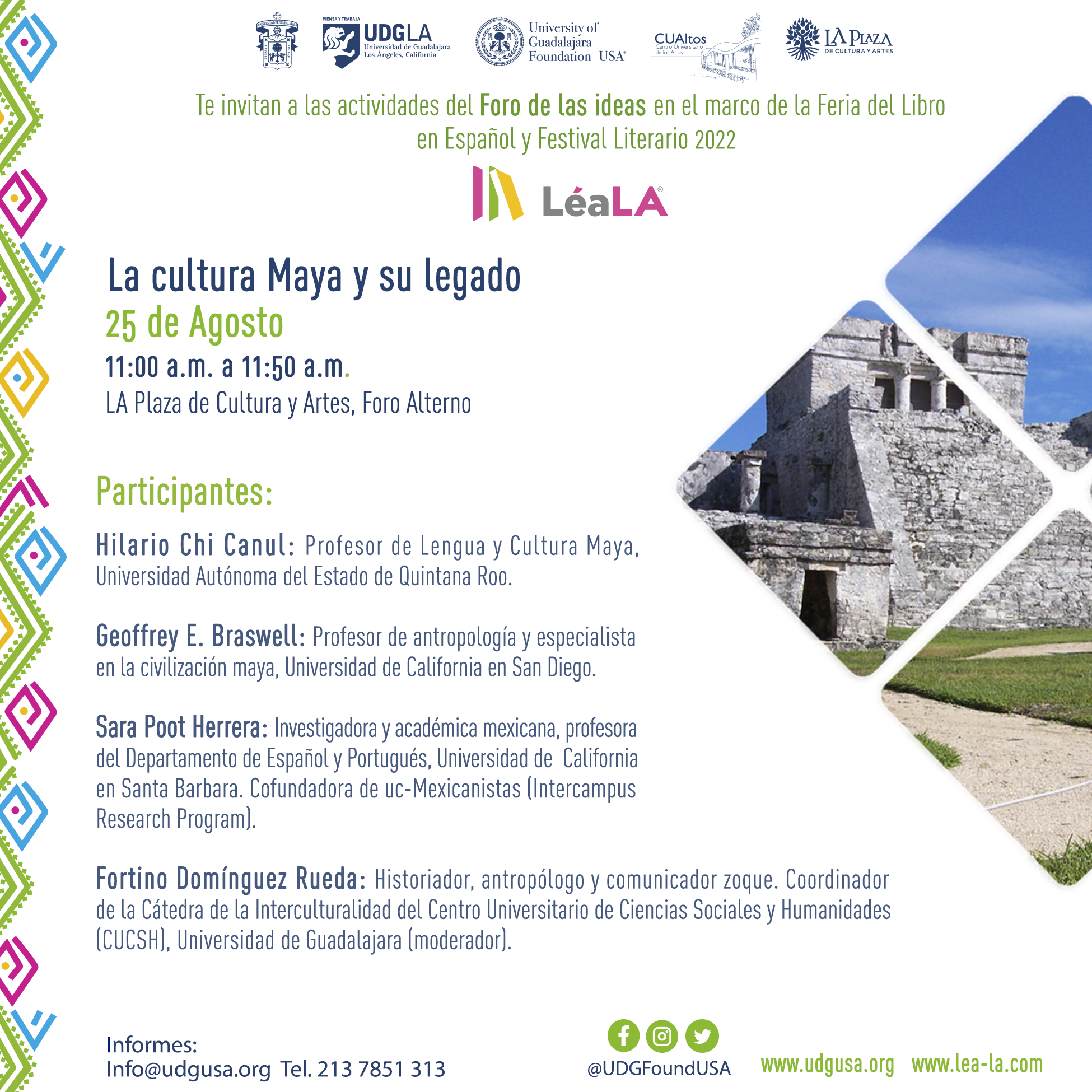 En el marco de LeáLA – Feria del Libro en Español y Festival Literario, que se realizará de 25-28 de agosto de 2022 en la ciudad de Los Ángeles California, Estados Unidos, tendremos la oportunidad de participar en el Panel: Cultura Maya y su legado. El panel tendrá lugar el jueves 25 de agosto a las 11:00 am. La actividad se desarrollará en La Plaza de Cultura y Artes, Foro Alterno, Downtown de Los Ángeles.
