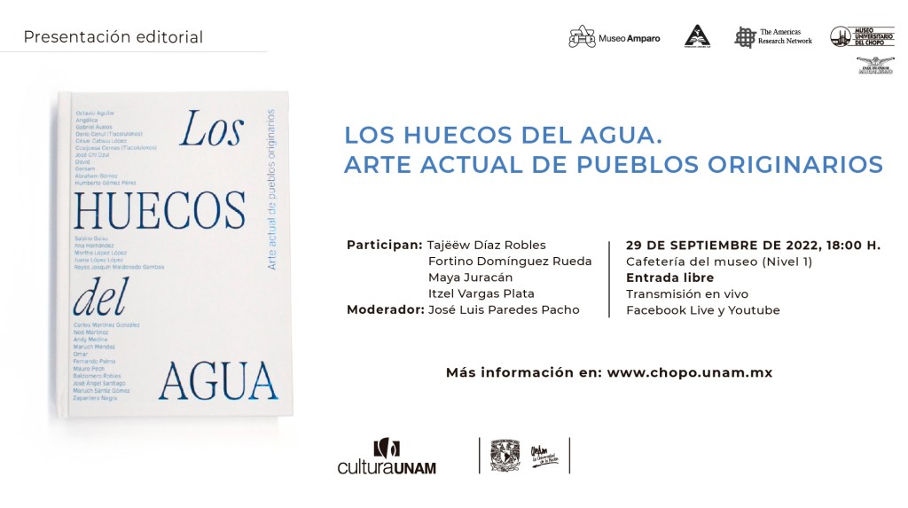 El próximo 29 de septiembre de 2022 en el Museo del Chopo de la Ciudad de México vamos a participar en la presentación del libro: Los huecos del agua, UNAM, México, 2021. El evento será una oportunidad para continuar reflexionado sobre la producción de conocimiento, la creación de estéticas decoloniales y así como del trabajo en colectivo que dio como resultado la creación de diversas piezas y registros que componen el libro.