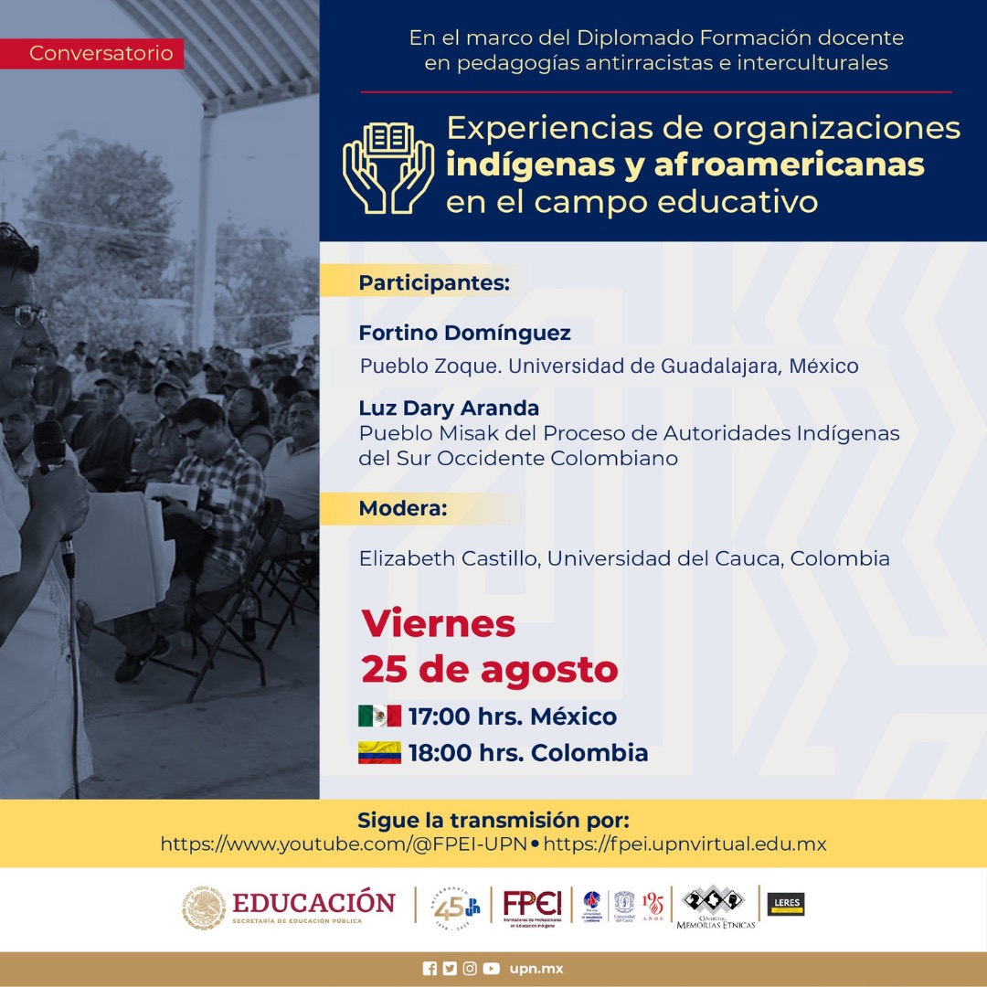 El viernes 25 de agosto de 2023 (17:00 horas México) en el marco del Diplomado Formación Docente en Pedagogías Antirracistas e Interculturales organizado por la Universidad Pedagógica Nacional (UPN, México) y el Centro de Memorias Étnicas de la Universidad del Cauca (Colombia) vamos a tener la fortuna de participar en el conversatorio Experiencias de organizaciones indígenas y afroamericanas en el campo educativo.
