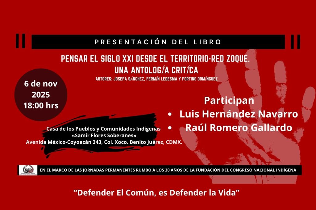 En el marco de las Jornadas permanentes rumbo a los 30 años de la fundación del Congreso Nacional Indígena les anunciamos que el próximo jueves 6 de noviembre de 2025 a las 18:00 hrs, vamos a presentar nuestro libro colectivo llamado: Pensar el siglo XXI desde el territorio red-zoque. Una antología crítica. Los textos son de Josefa Sánchez Contreras, Fermín Ledesma Domínguez y Fortino Domínguez Rueda quienes estarán en la presentación del jueves.